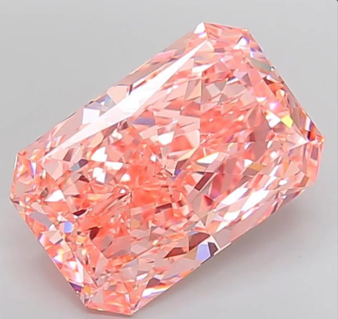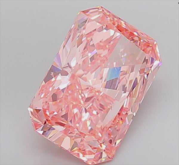 This breathtaking 10.07 carat Fancy Vivid Pink Radiant Cut Lab Diamond with secondary orange (IGI Report LG717569384) is a statement of elegance and modern luxury.